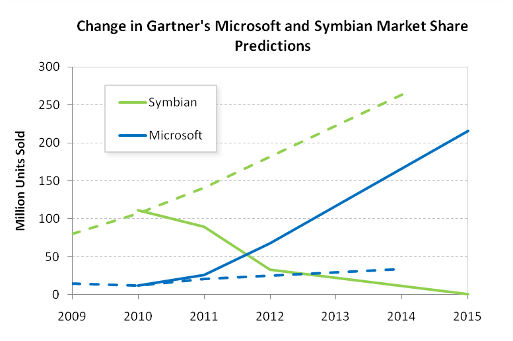 So how does Gartner's most recent prediction compare to their previous one? If we chart their predictions for Symbian and Microsoft that they released in August 2010, the difference is quite clear (previous predictions shown as a dotted line):