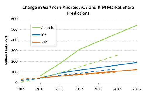 It is also interesting to look at how Gartner's predictions have changed for RIM, iOS and Android from August 2010 to April 2011: