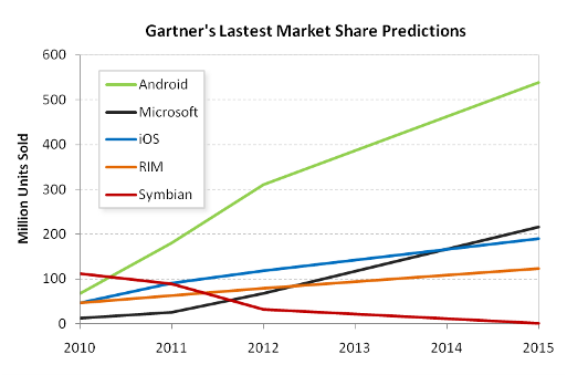 As others have reported, the smartphone market is highly volatile. The Nokia / Microsoft partnership has had a major impact on Gartner's view of the near future, I expect that other significant events will occur between now and 2015 that these will have an equal impact on Gartner's latest predictions, changing the landscape once again.