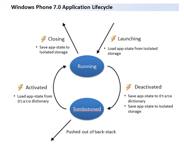 The WP7 (pre-Mango) application lifecycle, with the events that are fired for each transition, is illustrated below: