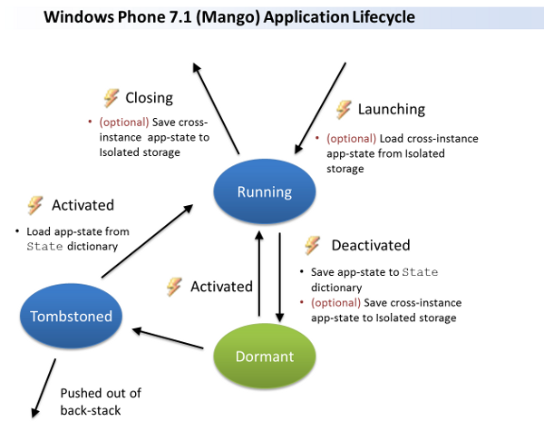 However, in order to pass the various Marketplace requirements and gain certification, your application must correctly handle the application lifecycle. With the recent Mango release, the lifecycle has become a little more complicated (although better! in that it adds multi-tasking / fast-app switching). I have also covered the lifecycle in a previous blog post and demonstrated how you can handle the various lifecycle events within an MVVM application.