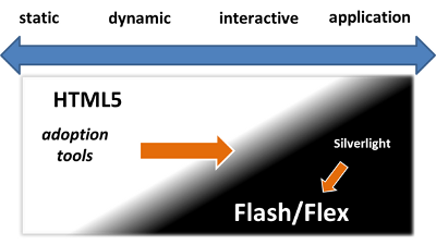 Earlier this year I collaborated with my colleagues, Graham Odds, a Flex guru, and Chris Price, a HTML5 guru, to write a White Paper comparing Flex, Silverlight and HTML5, which described how front-end technology choice should be based primarily on application complexity, with the two plugin technologies, Flex and Silverlight, being more suited to development at the more complex end of the spectrum.