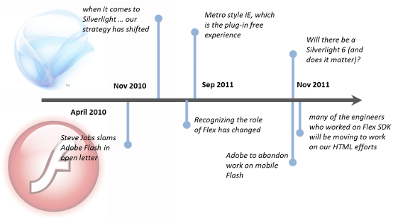 Silverlight first appeared four years ago, and has been struggling to gain the almost universal adoption of its direct rival, Flash. The cracks started to show in November last year when Bob Muglia blurted out that "when it comes to Silverlight ... our strategy has shifted". The cracks widened when the Windows 8 blog announced that the new Metro style IE would provide a "plugin-free browsing experience". The latest rumour is that Silverlight 5 will be the final version of the plugin, which, if true, would be a great shame. The technology is mature and adoption is now greater than 75%, this is the point where Silverlight really should be taking off in a big way.