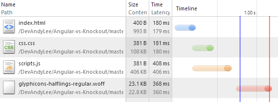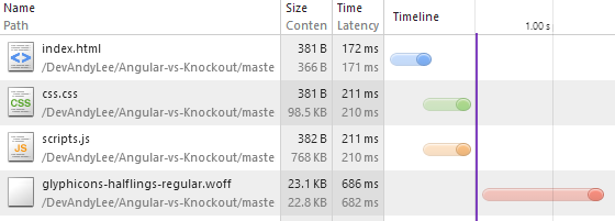 The Angular project didn’t have any of this, so I decided to create my own using Gulp. It’s easy enough to package together all the JavaScript files and minify them, but that still leaves all the partials (several of which need to be downloaded for the home page thanks to the components). Luckily there are solutions to this problem. I used gulp-angular-templatecache to preload the templates and insert them into Angular’s TemplateCache, so that it doesn’t have to download them. The resulting JavaScript file can then be bundled with the others. In a similar approach to the Knockout project, I have only bundled the partials needed for the home page, so the others are loaded on demand. This isn’t quite as good as the Knockout version, since we still have to load all the JavaScript for the application in one bundle, but it should still help a bit in a large application.