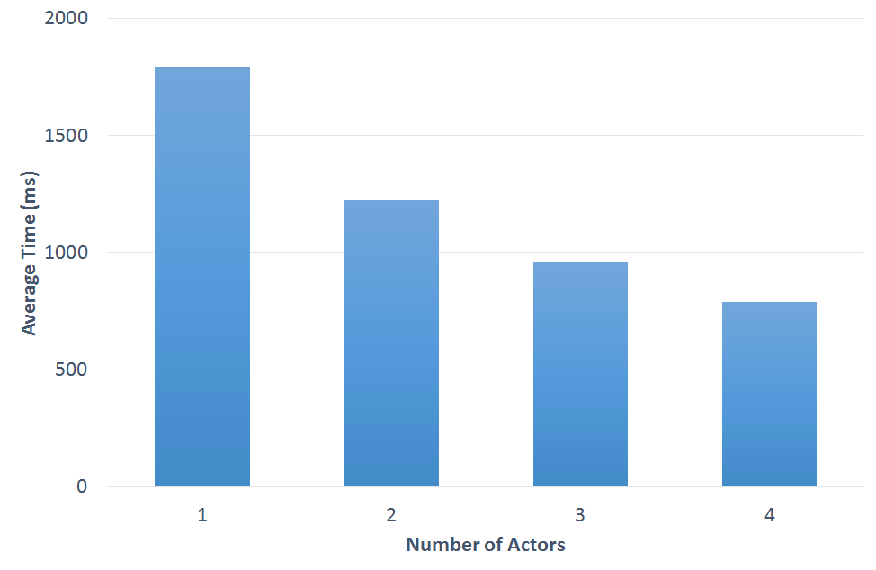 I executed the program a number of times with one to four Actors in the pool and measured the average time it took for the program to execute. The graph below shows the results. With one Actor the average time was 1790ms, this time was drastically decreased to 788ms when four Actors were used. There is a significant performance improvement each time the number of Actors in the router pool is increased and there was more than a 50% reduction in the execution time by changing from one to four actors in the pool.
