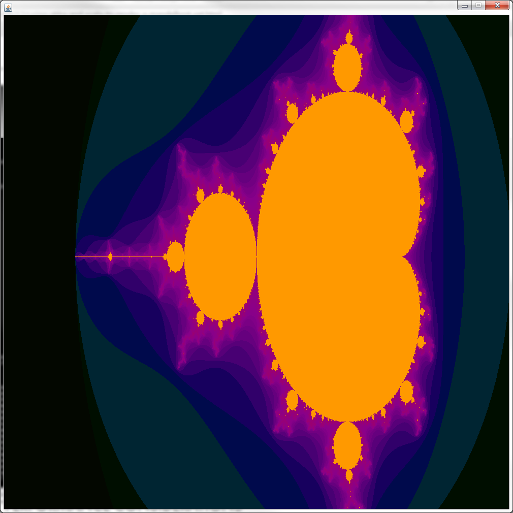 }This algorithm is based on histogram colouring. All it does is extend a JFrame and overrides the paint method. In this implementation each pixel is looped through and given a colour based on the number of iterations it took to ‘escape’ from the algorithm. This can be created by adding one more line to the Result Handler: