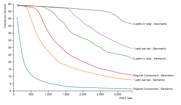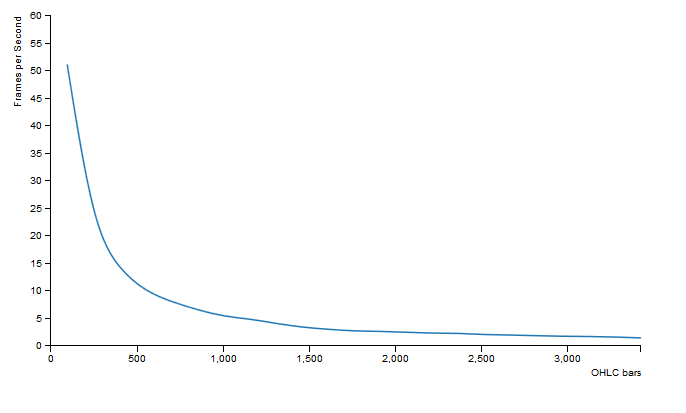 How does this chart perform when panning/zooming as the number of OHLC bars grows? Well, it’s a bit disappointing. The chart below shows the number of frames per second achieved when panning the chart in Google Chrome on a modern desktop computer against the number of OHLC bars on the chart. You can see that the number of frames per second drawn drops off quickly as the number of OHLC bars grows. This is because with SVG and semantic zooming, we have to update the attributes of every DOM node that makes up the OHLC series.