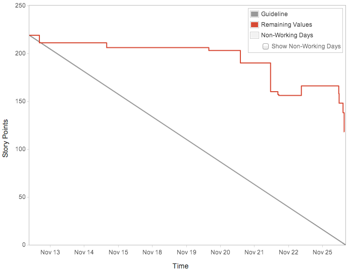 During the sprint, we estimated tasks in days and hours depending on how many “developer-hours” we had that fortnight, taking into account team size and upcoming holidays. When work was done, we would log hours against the task and chart the remaining time as a burndown chart.