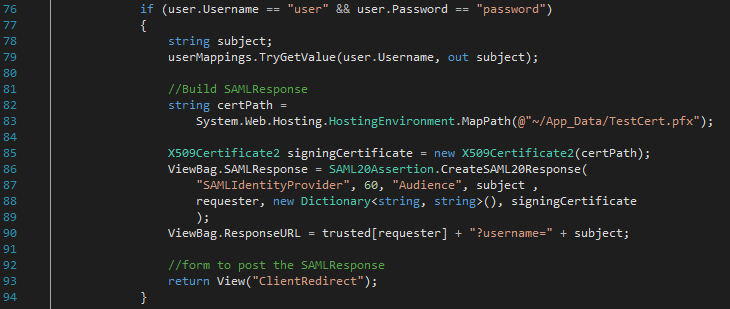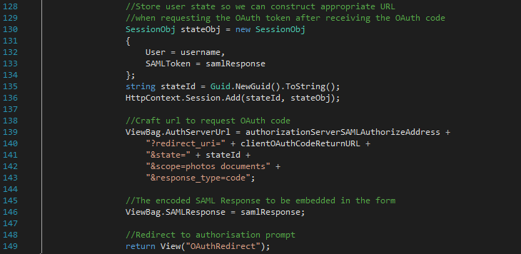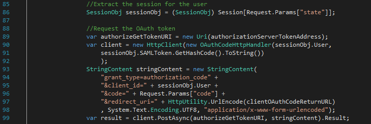 The Client app uses the state parameter to access the user’s session state (ClientController.cs line 86) and issues a POST back to the Authorisation server in order to exchange the authorisation code for an OAuth access token (ClientController.cs line 99). The request includes the username and SAML hash to be compared as means of authentication (ClientController.cs line 90).