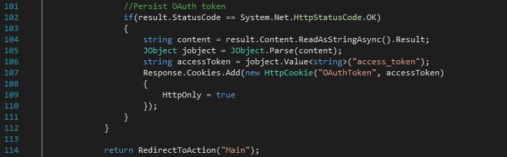 The Client app stores the OAuth access token in a cookie and redirects the user agent to the Main view (ClientController.cs line 114). The user now sees the form with “Get resource” button again.