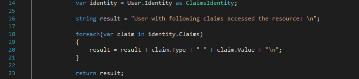 The user has already authenticated and authorized the Client app so the OAuthToken from the cookie is sent as well. The OWIN middleware on the Resource server parses the OAuthToken and sets the user identity automatically. The identity information is extracted and returned as a response to the Client app (ResourceController.cs line 14).