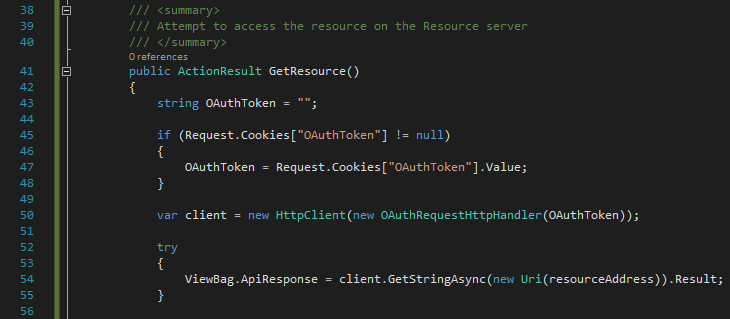 2) The user clicks ‘Get Resource’ button in the user agent issuing a GET request to the Client app. The Client app in turn tries to access the resource on behalf of the user by issuing a GET request to the Resource server. If the user is already authenticated and authorized then an OAuthToken is stored in a cookie. The Client attempts to extract the token from the cookie (ClientController.cs line 47) and adds it as a URL parameter to the resource request using the OAuthRequestHandler (ClientController.cs line 50). The GET request is then issued (ClientController.cs line 54).
