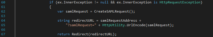 As the user is not authenticated the Resource server does not receive an OAuthToken and returns Unauthorized to the Client app – this is done by the OWIN middleware. The Client app then redirects the user agent to the SAML server for authentication and includes a SAML request as a query parameter (ClientController.cs line 65).