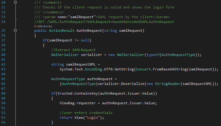 The SAML server receives the request, checks that the issuer of the SAML Request is in the list of trusted sources (SAMLController.cs line 48) and returns the Login view to the user agent. The user now sees the login form.