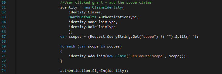 6) The user clicks the “Grant” button. The user agent issues a POST request to the Authorisation server. The Authorisation server creates a new bearer type identity for the user with all of the rights that the user authorised. (OAuthController.cs line 61).
