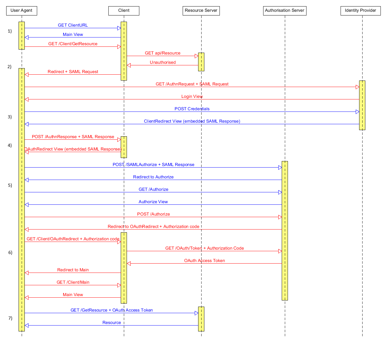 Here the Client gets a SAML bearer assertion from the SAML Identity Provider then requests an access token from the Authorisation Server using the SAML bearer assertion as proof of identity. The Authorisation Server then verifies this and passes back an OAuth token which is used by the client to access the Resource Server. In our solution we use OAuth2 Authorization Code Grant flow.