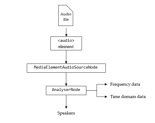audioElement.src = URL.createObjectURL(file); // eg. blob:http%3A//127.0.0.1%3A8080/af643450-98a6-4eac-aa87-ea9347ee007bWith the element created, the audio would play to the speakers straight away if it started playing. So, an AudioContext and MediaElementAudioSourceNode are created as follows:
