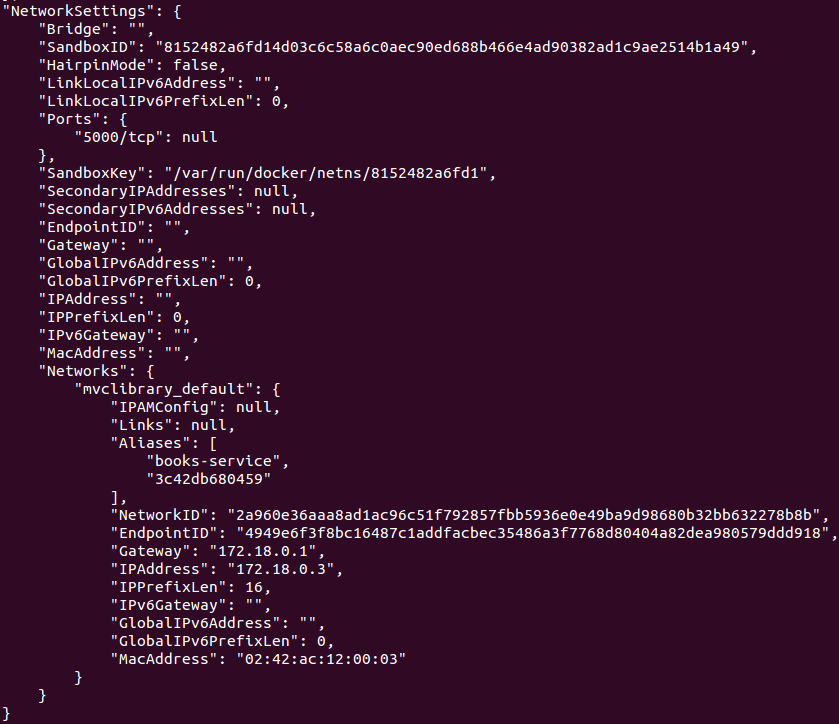 Now docker inspect books-api to confirm the application container is using this network: