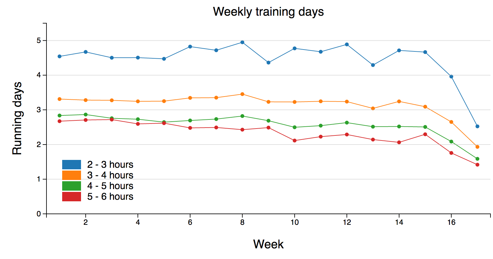 The following charts plots the average number of days each week that athletes log a run on Strava: