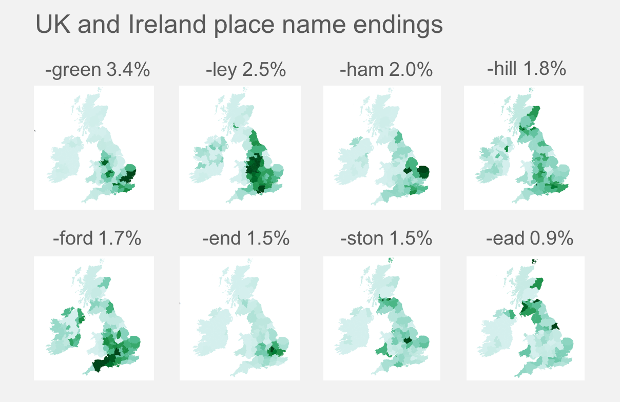 I grew up in East Anglia, and one of the things I noticed about my surroundings was the unusual number of places that seemed to end in -ham, which means farm or homestead. Recently, on recalling this observation, I thought it would be fun to see whether place names really did appear in clusters.