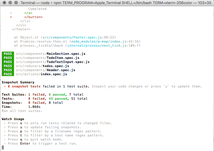 It’s obvious from the change I made that this diff is expected. So, all I need to do now is tell just via it’s task runner to update the snapshots (as simple as pressing the U key).