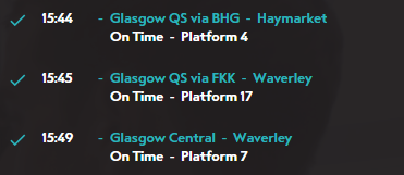 Over the course of the project, there were a number of challenges in getting everything to work together in a stable manner. For example, the Transport section was significantly more complex than the others as it required gathering data from multiple API’s, whereas the other sections only required one. One of the unexpected challenges for Transport was generating the ‘Via’ message for the train, as seen below. Some trains will have their name always showing a station they are going via, for example, “Glasgow Queen Street via Falkirk”. This sounded simple to implement and would make it much clearer which trains to catch but turned out to be slightly more challenging. As the NRE API does not respond with the name that would be displayed in the station, we had to find a way to generate this on our end.