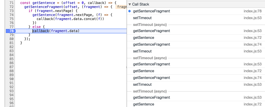 The recursive version of the getSentence function that uses callbacks is not very easy to follow, with the nested callback introducing more functions and scopes.