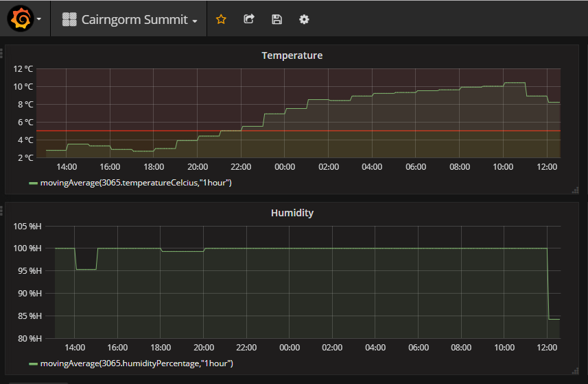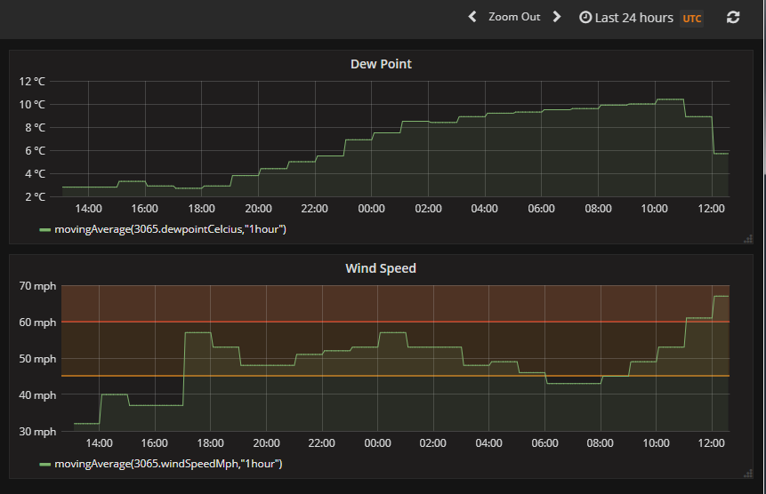 Grafana has time selection facilities very similar to Kibana, and so it’s easy to zoom in and out and look at data from various ranges. Once this application has been running for a while it will be possible to look back over the last few weeks, perfect for forecasting ice climbing conditions!