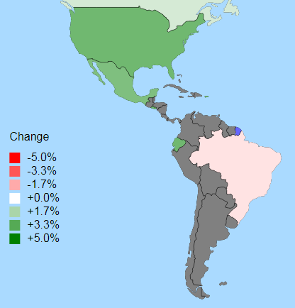 Countries are coloured on a linear scale from red (base has weakened against) to white (no change) to green (base has strengthened against). The sentiment perspective is therefore that of a buyer in the base currency (e.g. an importer), given the positive/negative connotations of green/red. To do this, we use a linear scale with a central pivot at zero (white):