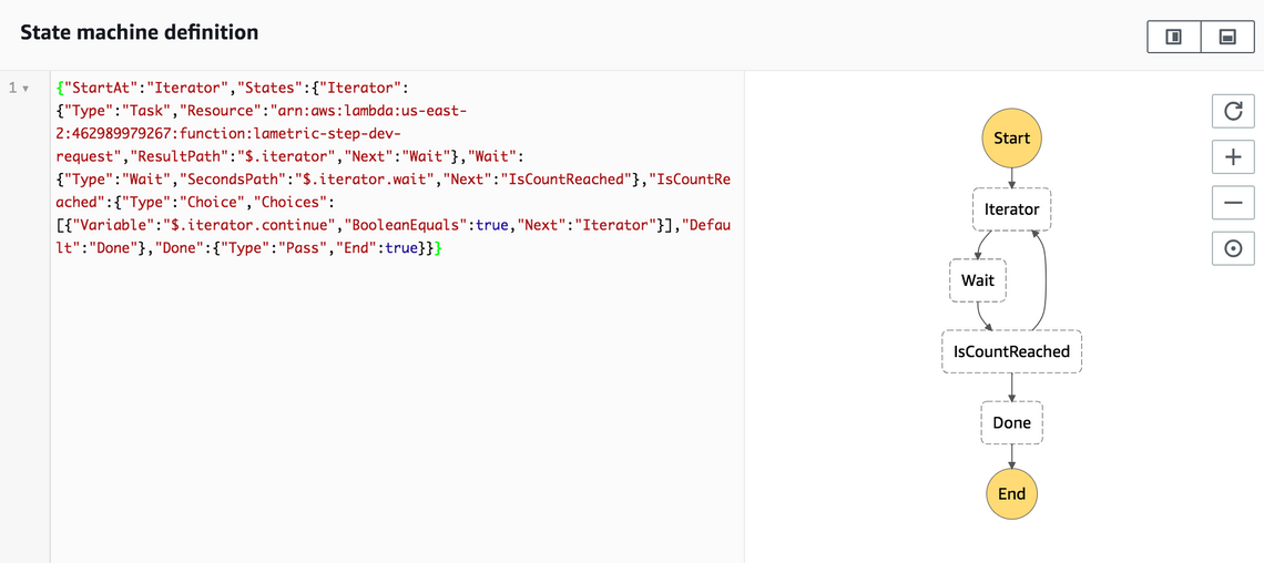 Notice that the lambda only returns the iterator state, the ResultPath: "$.iterator" configuration ensures that the data returned by this function is merged into the machine data at the iterator path.