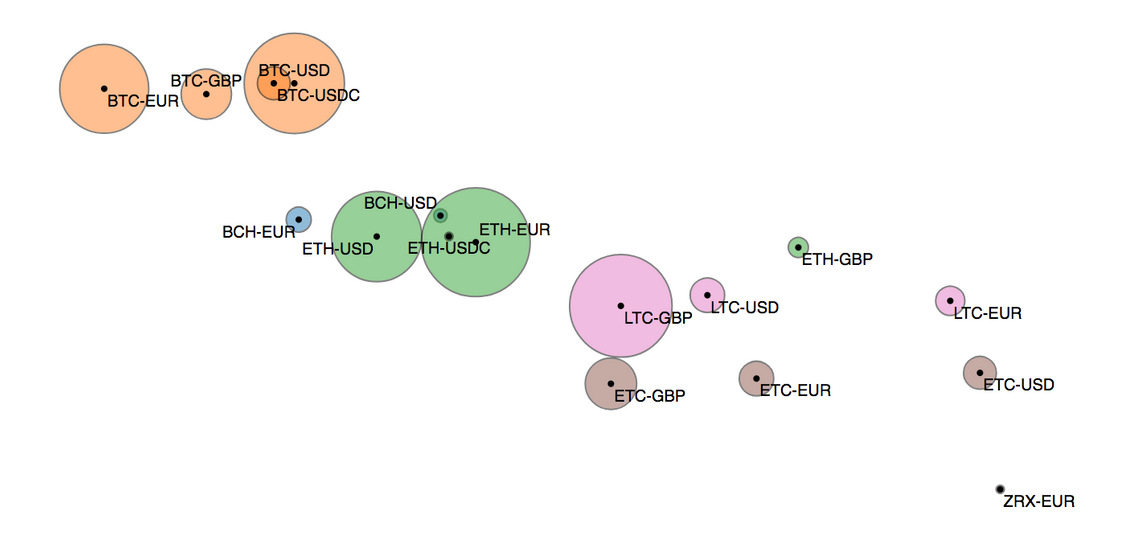 Our d3fc project has a number of D3 components which make it easy to create bespoke charts. The following code uses the to_colums method from the Perspective view to access the computed view. It uses the d3fc point series, and chart components to create a scatter plot. Additional D3 scales are used for determining the colour of each point, from the base currency, and the size, based on the total number of orders: