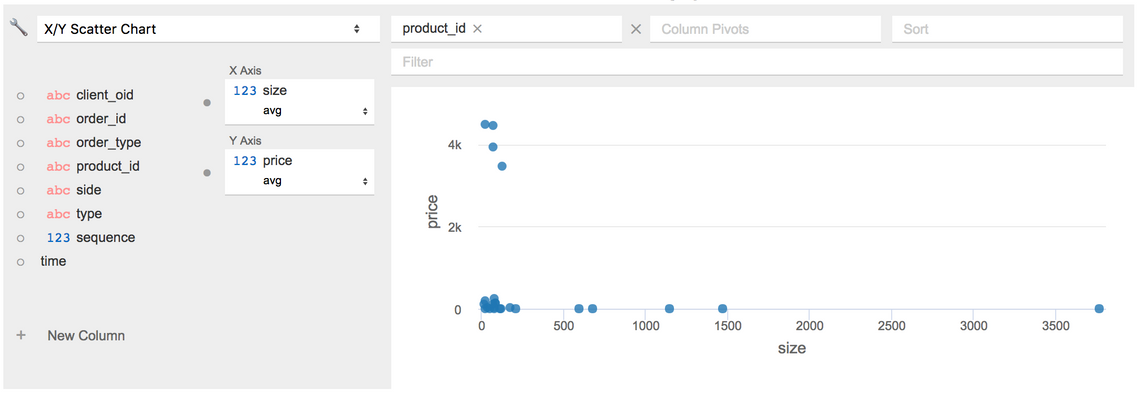 Perspective has a plugin model where new visualisation types can be added to perspective-viewer. Here’s an example of scatter chart showing the average price versus size for each product: