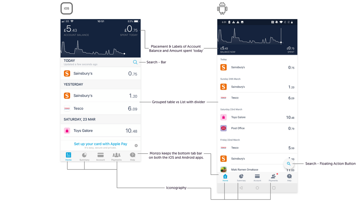 Let’s take a look at how three of the major UK challenger banks; Monzo, Starling and Revolut deal with cross-platform design. They all have a ‘mobile-only’ business model, so their mobile applications are paramount to their success.