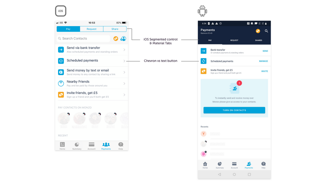 The final point on platform specific design relates to the different technology available on each. One small example is that on the Android Monzo app, users can use the ‘App Shortcuts’ to go directly to the ‘summary’ or ‘support’ pages, which is a relatively easy feature to implement on the Android app due to the way it is built. The same feature could be added to the iOS app, but this would require a lot of development effort. Should we make it our priority to try and keep the exact same features on both apps, or should we use our design and development effort to utilise the technology and features that are available to us per platform?