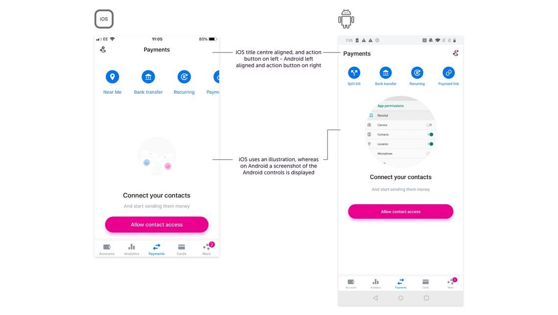 These three challenger banks have taken slightly varying degrees of approaches to the issue of cross-platform design, with Monzo edging towards the Platform specific end of the scale, Starling opting for more of a mix of custom and native components, and then Revolut pushing for platform parity.