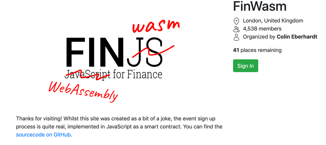I wanted to try and create a more meaningful smart contract than a simple counter app. It just so happened that I was due to do a talk at the FinJS conference on WebAssembly ‘out of the browser’. I thought it would be fun to create a spoof meetup, called FinWASM, where the signup process was managed by smart contracts!