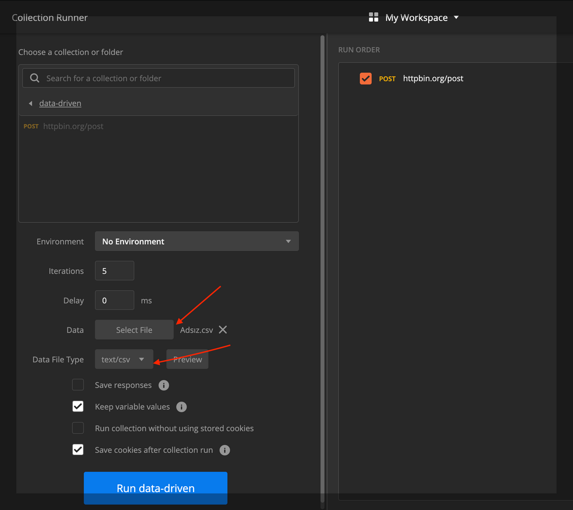 Here is an end2end scenario of executing requests through the collection runner. I supplied a data file in CSV whose values are replaced while the request is getting executed.