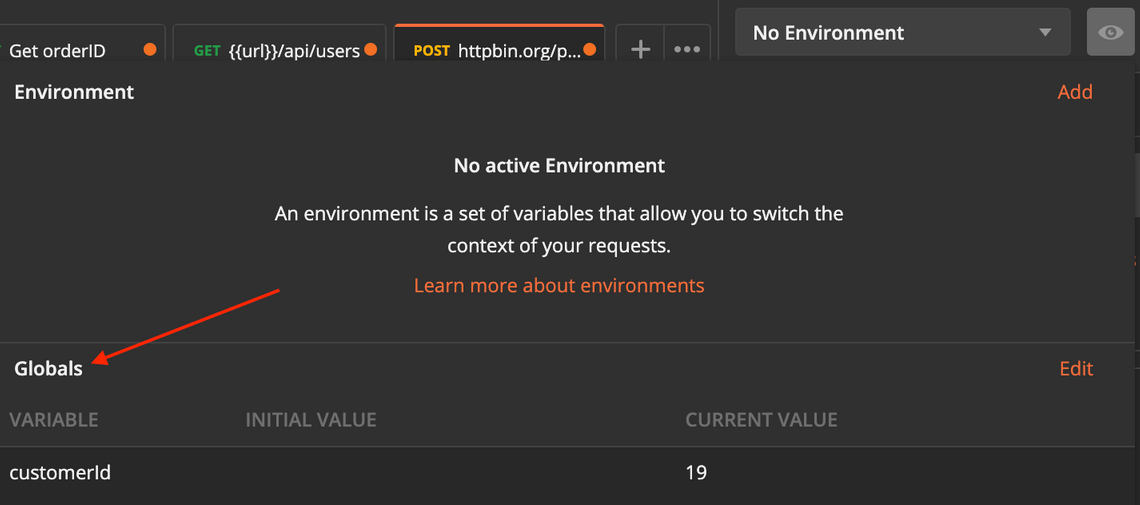 When you click on the eye icon next to environment dropdown, a context window will be opened with details around the current global variables. By clicking edit you can create a new global variable by entering a name and an initial value.