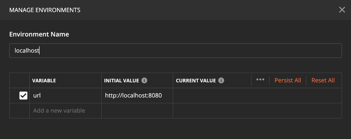 Add an environment name which will also show in the environment selector. Here you can enter the environment specific variables.