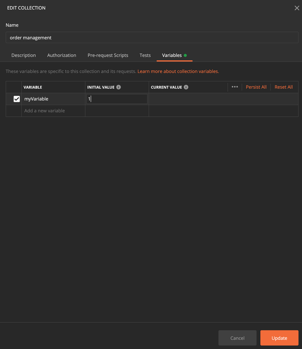 To add a collection variable, click edit, go to the Variables tab, add your variables and update it.