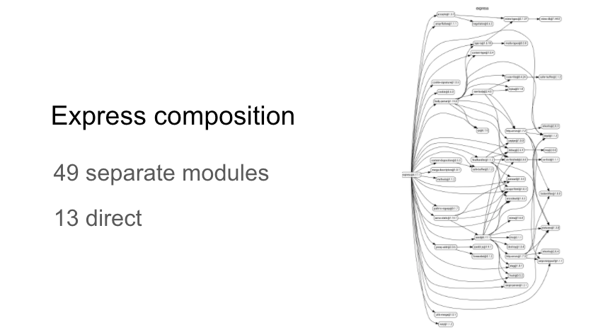 I can see the benefits to a more componentised approach, these high-level building blocks allow you to quickly assemble new and novel solutions (for example a few years ago I wrote my own static site generator in little more than 100 lines of code). However, if I’m trying to assess the overall health of Express, I’m not just checking 1 project, I’m now checking 49 of them!