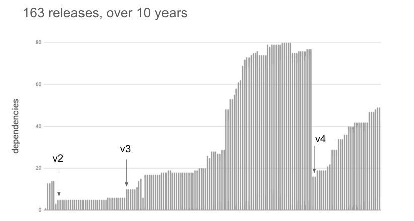 You can see that Express itself has become increasingly componentised over time. Interestingly, the number of dependencies dropped significantly when v4 was released, only to start rising once again. Major releases are often a convenient time for consolidation and clean-up.