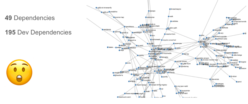 However, this dependency graph is only half the story. Projects like Express have an additional set of dependencies that are used during the development process. In this case, Express has a total of 195 development dependencies when the dependency graph is fully resolved: