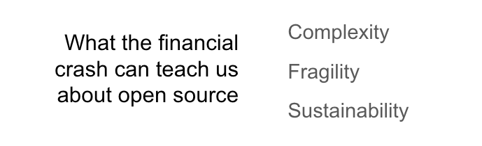 There is much in common between the challenges of open source and the environment that causes the financial crash of 2007. In both cases there was a lack of understanding and an unwitting exposure. What I hope is different is the way that we tackle these challenges!