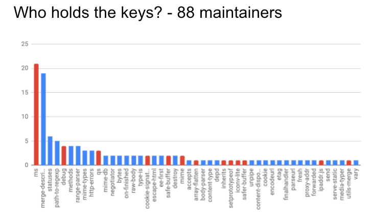 I took a look at npm, and found that these packages were ‘governed’ by a total of 88 maintainers. The following chart shows the number of maintainers for each package: