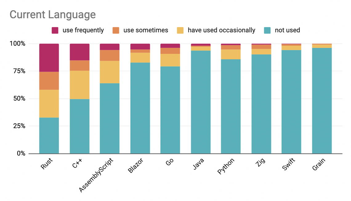 Rust, at 26%, is the most frequently used language, followed by C++ then AssemblyScript.