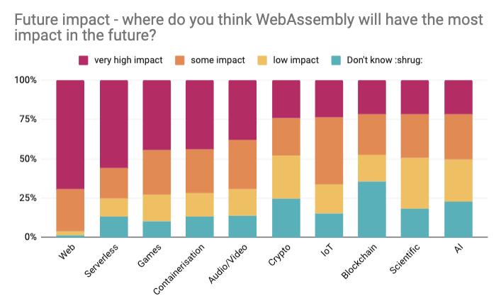 However, the survey respondents expect WebAssembly to have a significant impact across quite a wide range of different application areas, and Serverless leads the way with 56% seeing this as a high impact application.