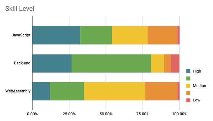 Respondents were asked to declare their skill level in JavaScript, Back-end and WebAssembly development: