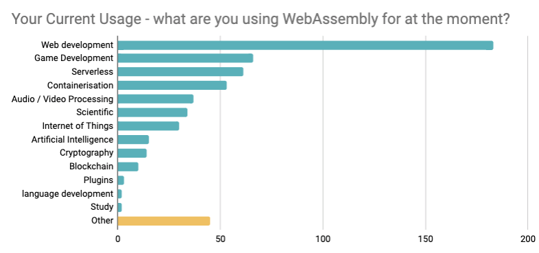 The survey asked what are you using WebAssembly for at the moment?, allowing people to select multiple options and add their own suggestions. Here are all of the responses, with ‘Other’ including everything that only has a single response: