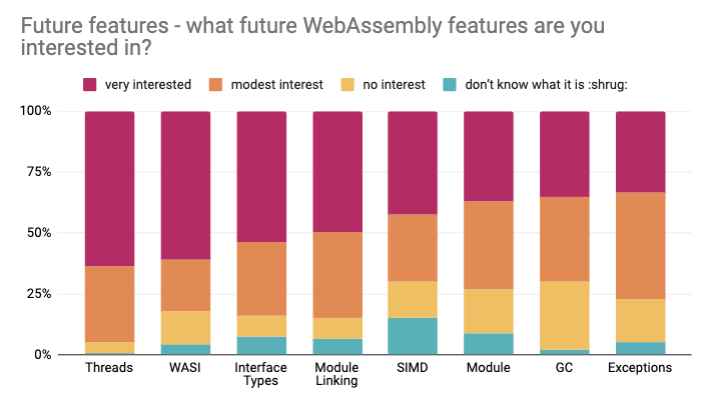 I was a little surprised to see Garbage Collection so low down people’s priority list. Languages such as C# and AssemblyScript have to ship their own garbage collector as part of the WebAssembly modules. This proposal opens the door to integration with the host garbage collector, resulting in smaller, more efficient modules.